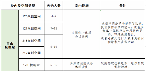 为方便读者开展专题研讨和学术交流,图书馆面向全校师生提供研讨空间预约服务。 一、预约方法 1.预约途径。青山馆众创空间、黄家湖馆研究室均实行预约使用制,可使用时间为8:30-21:30,读者可提前3天登录“座位与空间预约系统”进行预约。 (1)网页预约:http://ic.lib.wust.edu.cn/ (2)公众号预约:武汉科技大学图书馆微信公众号→热门服务→空间预约 2.填写申请。登录预约系统后,前往个人中心,在联系方式栏目填有效手机号,完善个人信息后,填写预约申请。 3.取消预约。若不能按时使用,请提前在预约系统取消预约,否则产生违约记录。 二、使用须知 1. 预约成功后,申请人及成员须提前5分钟刷卡签到,若超过预约时间30分钟未签到,本次预约自动取消,记违约一次。 2. 如刷卡人数未达到房间要求的最少使用人数(如:团体研究室须6人以上),记违约一次。 3.房间仅作专题研讨和学术交流之用,严禁其它用途,不得交换或转让他人使用,一经发现,将取消使用权。 4.开展专题研讨和学术交流活动时,请控制音量,勿反锁房门,遮蔽门上玻璃。 5.请爱惜设施,规范使用设备,使用中有疑问或遇设备故障等问题,联系值班人员处理,黄家湖馆在202学习空间中部,青山馆在西裙楼213、215室。 6.请妥善保管个人物品,若有遗失,自行负责。 7.使用完毕,请将桌面和室内清理干净,按提示关闭电脑、屏幕等设备,将设备及座椅复位,关闭灯光、门窗,检查完好后离开。 8.空间预约管理系统采用信用积分制,在空间预约系统“个人中心”可查询。每位读者有300积分,违约一次扣100积分,信用积分扣完,5天内不可进行预约,5天后恢复300积分。 三、开放预约空间简况